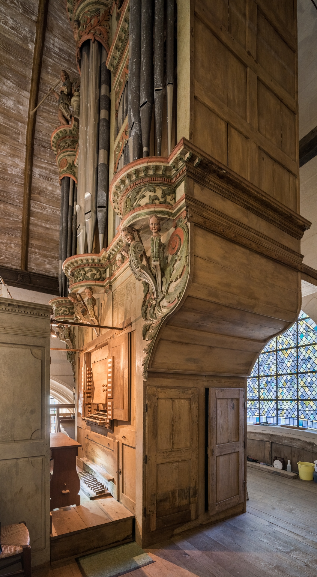 Vue de détail : buffet du grand orgue et départ du positif dorsal.Immatriculation