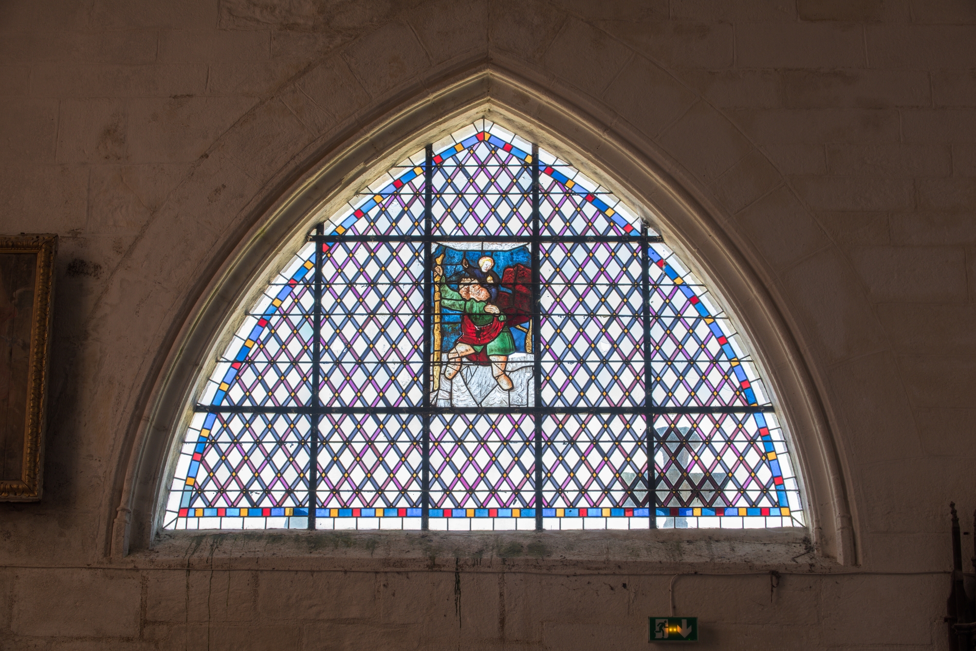 Vue d'ensemble : verrière de la baie 8 intégrant en remploi un panneau de vitrail représentant saint Christophe.Immatriculation