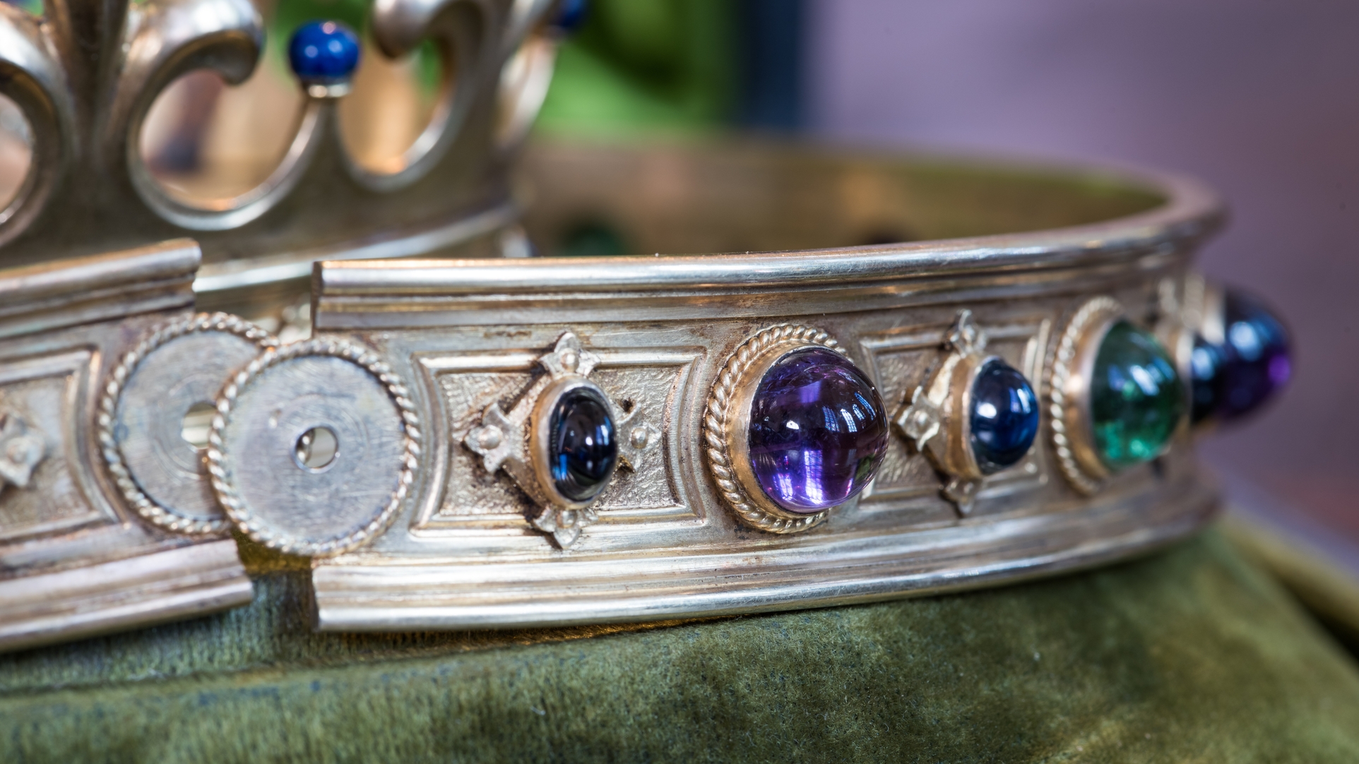 Vue de détail : cabonchons d'une des couronnes de procession de la Vierge ouvrante.Immatriculation