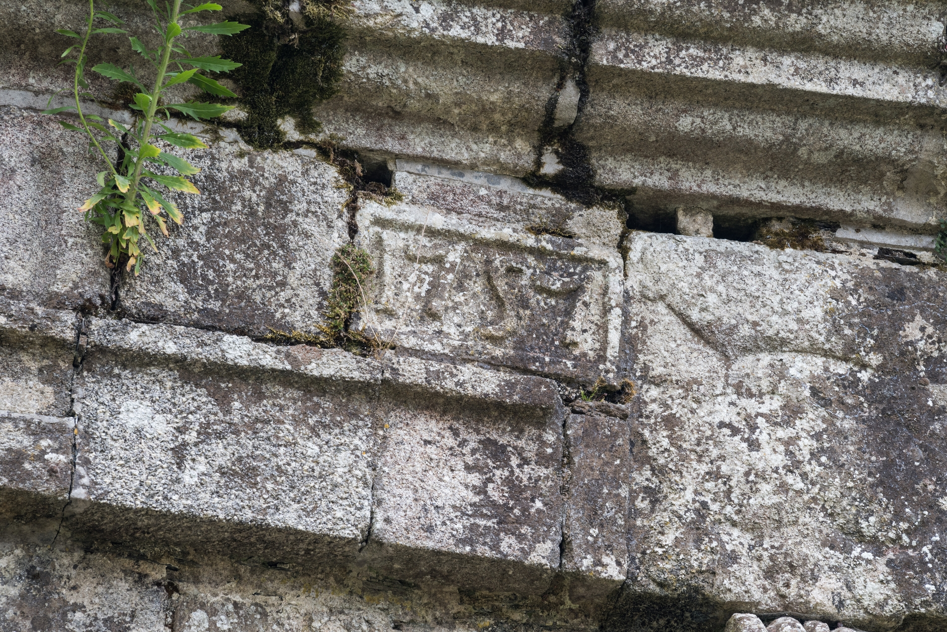 Vue de détail : cartouche portant la date de "1757" sur la façade antérieure de la scala sancta, au niveau de la frise de l'entablement.Immatriculation