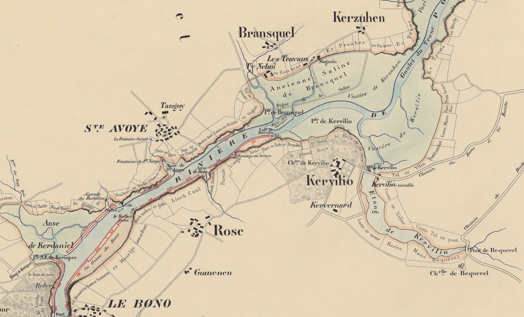 Extrait de la carte des côtes du quartier maritime d'Auray, dressée par D. Ragiot en 1880. Les salines du Bransquel (Pluneret)Immatriculation