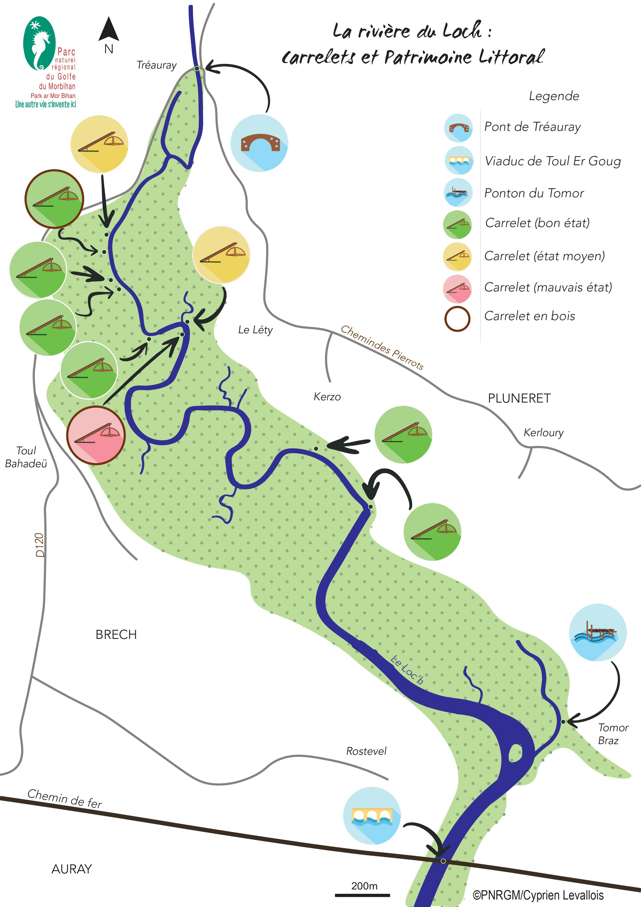 Carte de répartition des carrelets dans le Golfe du Morbihan, le long de la rivière du Loch - PNR Golfe du Morbihan (2017-2019).Immatriculation