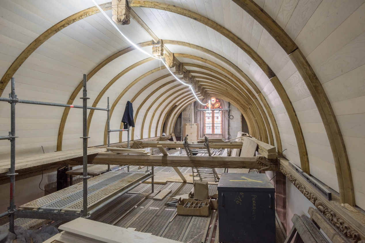 Charpente lambrissée reconstruite suite à l'incendie (état en 2021)Immatriculation