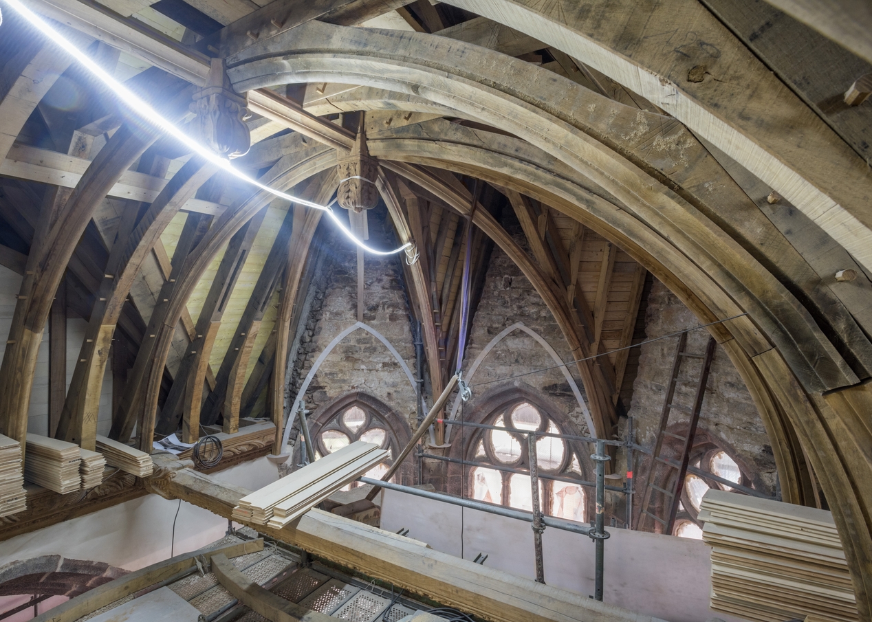 Charpente reconstruite sur le chœur suite à l'incendie, en attente de la pause du lambris (état en 2021)Immatriculation