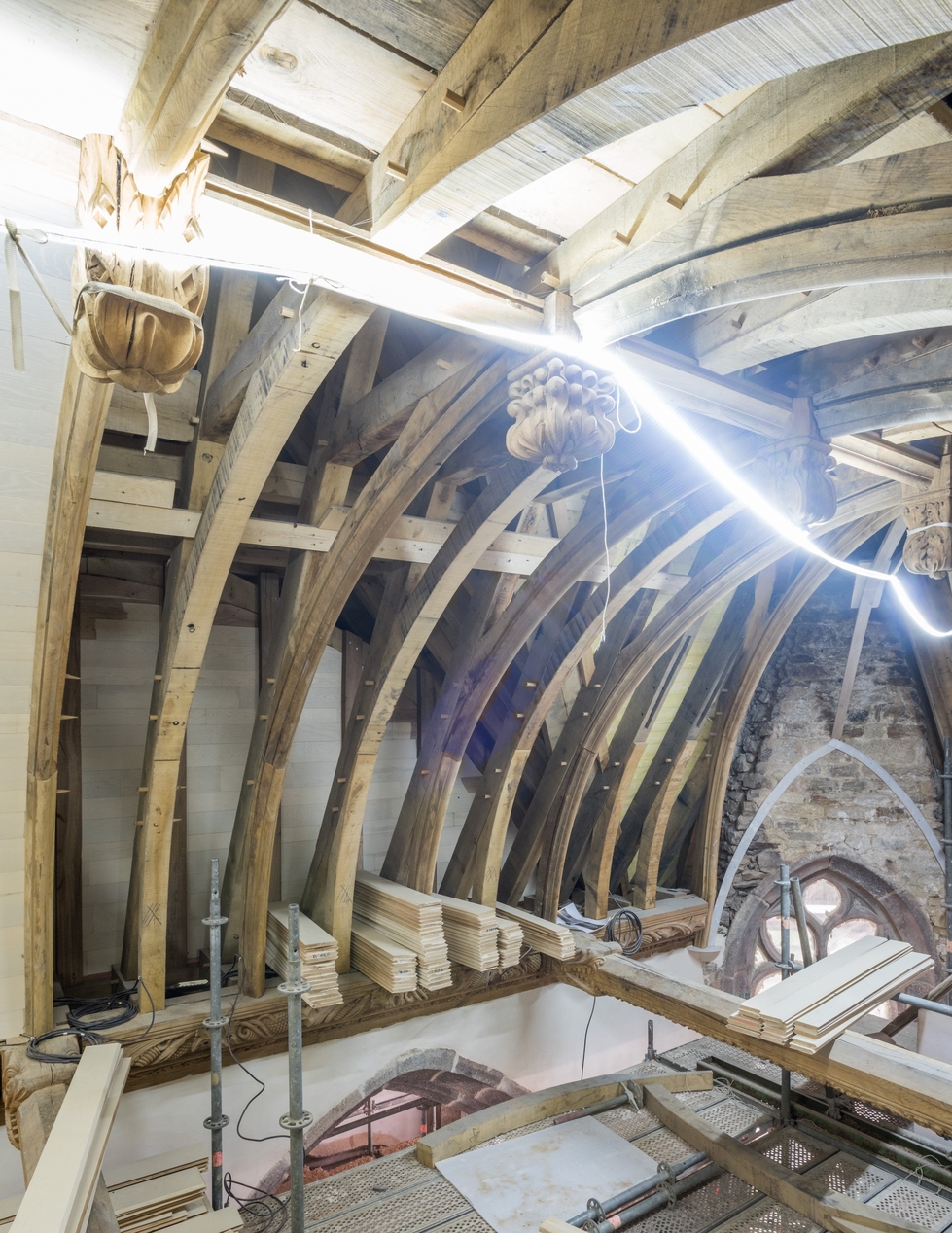 Détail de la charpente reconstruite suite à l'incendie, en attente de la pause du lambris (état en 2021)Immatriculation