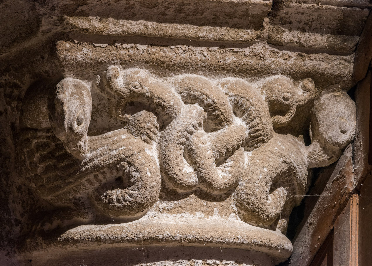Détail d'un chapiteau : oiseaux et serpents formant un noeud gordien ou entrelacImmatriculation