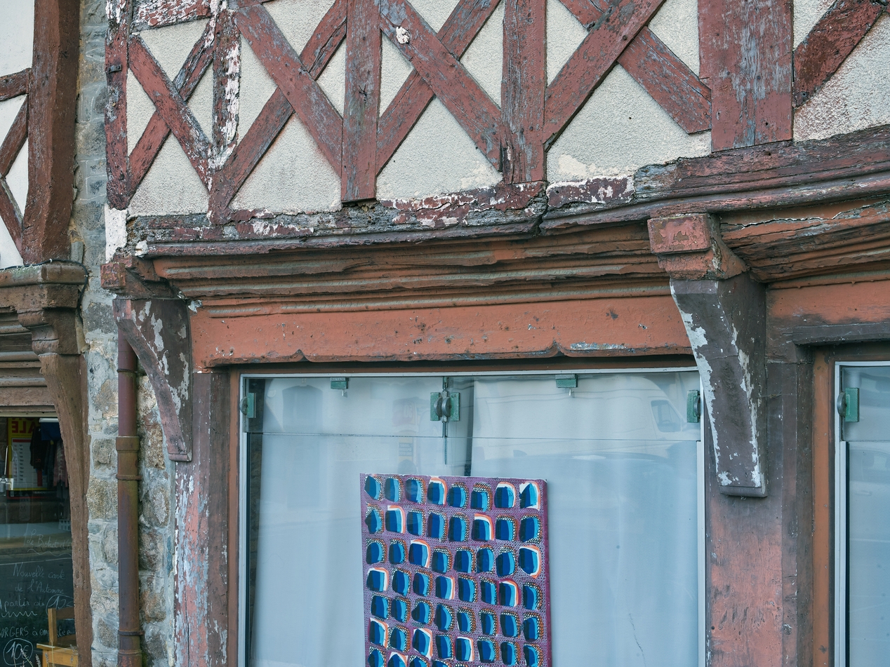 Détail de l'encorbellement entre le rez-de-chaussée et le premier étage. La sablière et les entretoises sont moulurées, des consoles soutiennent les abouts de poutre.Immatriculation