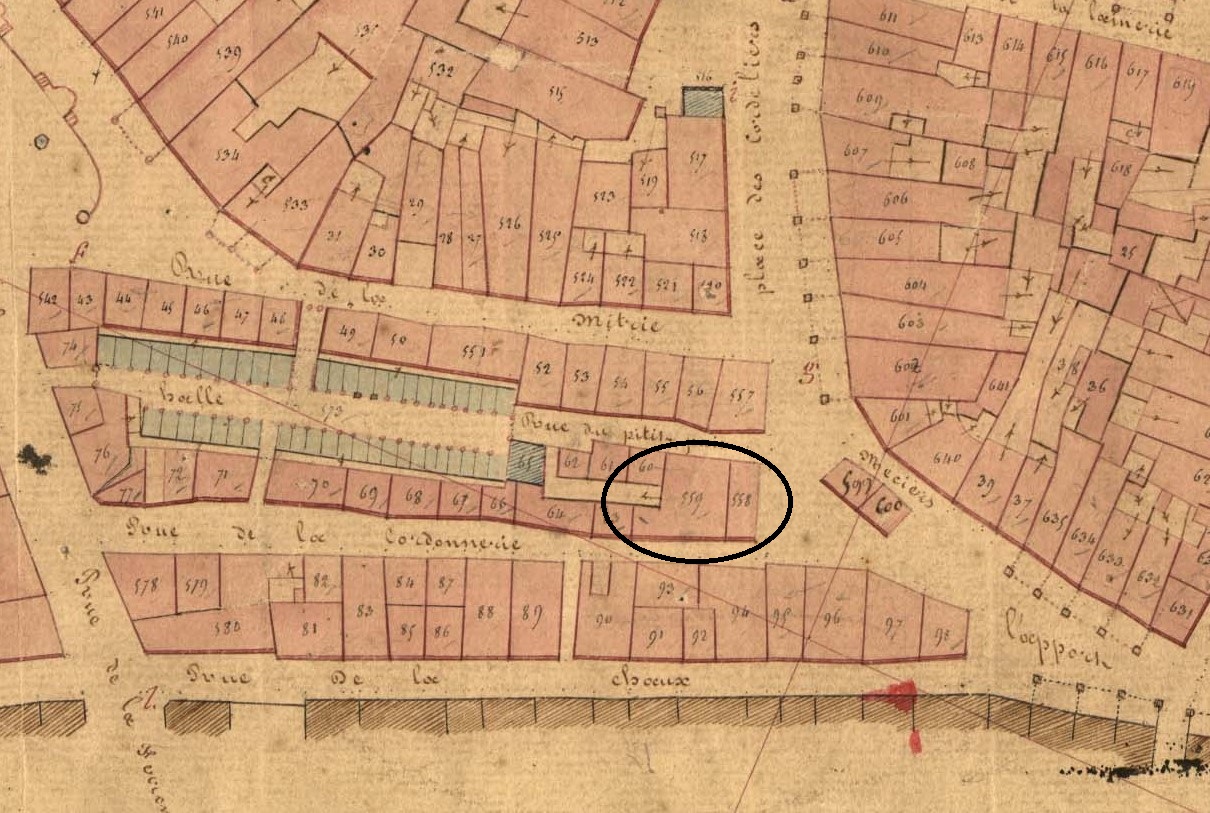 Emplacement de la maison de La Mère Pourcel au sein de l'îlot du Vieux DinanImmatriculation
