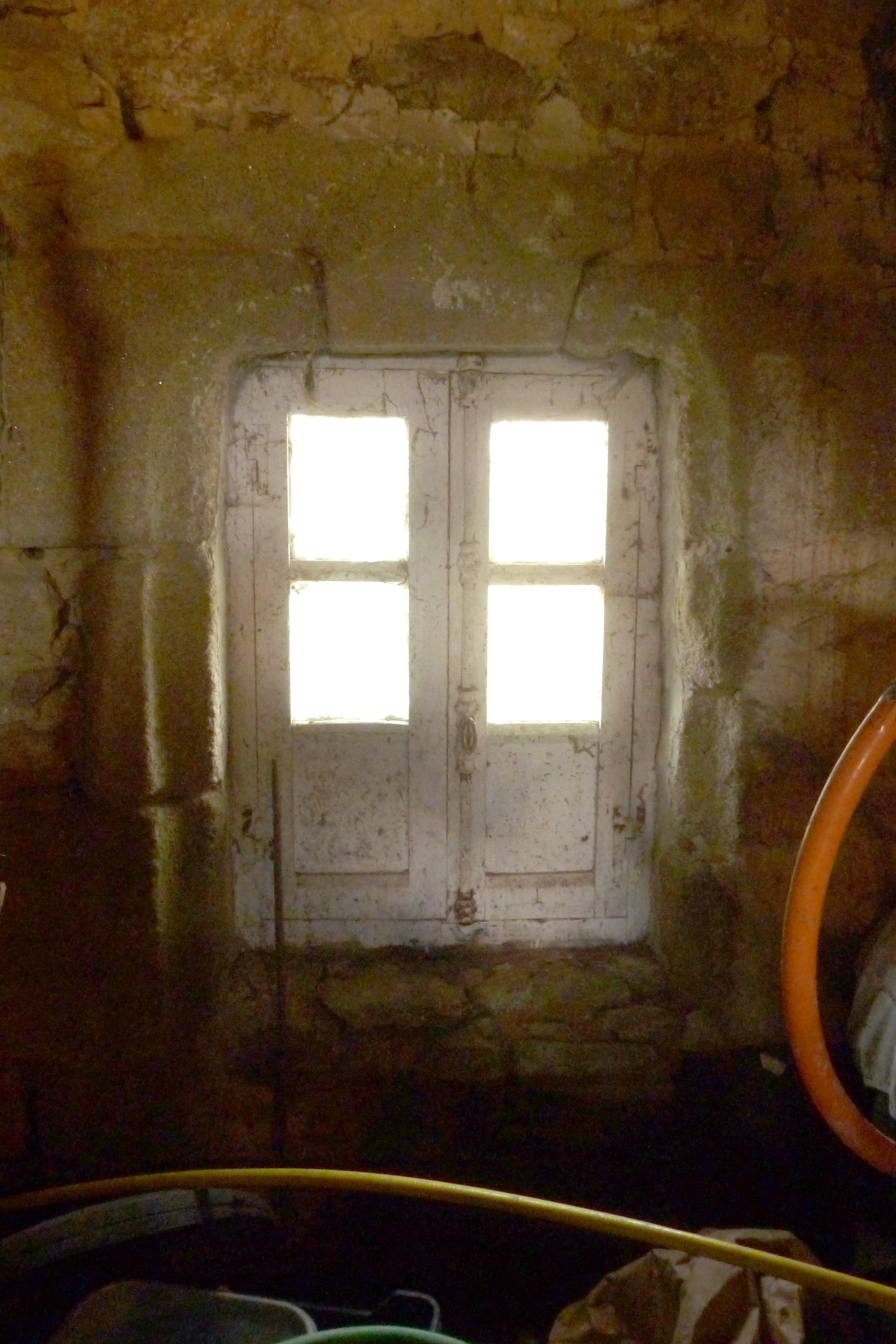Kerseon, ferme 1. Ecurie, porte en anse de panier en réemploi sur le mur nord.Immatriculation