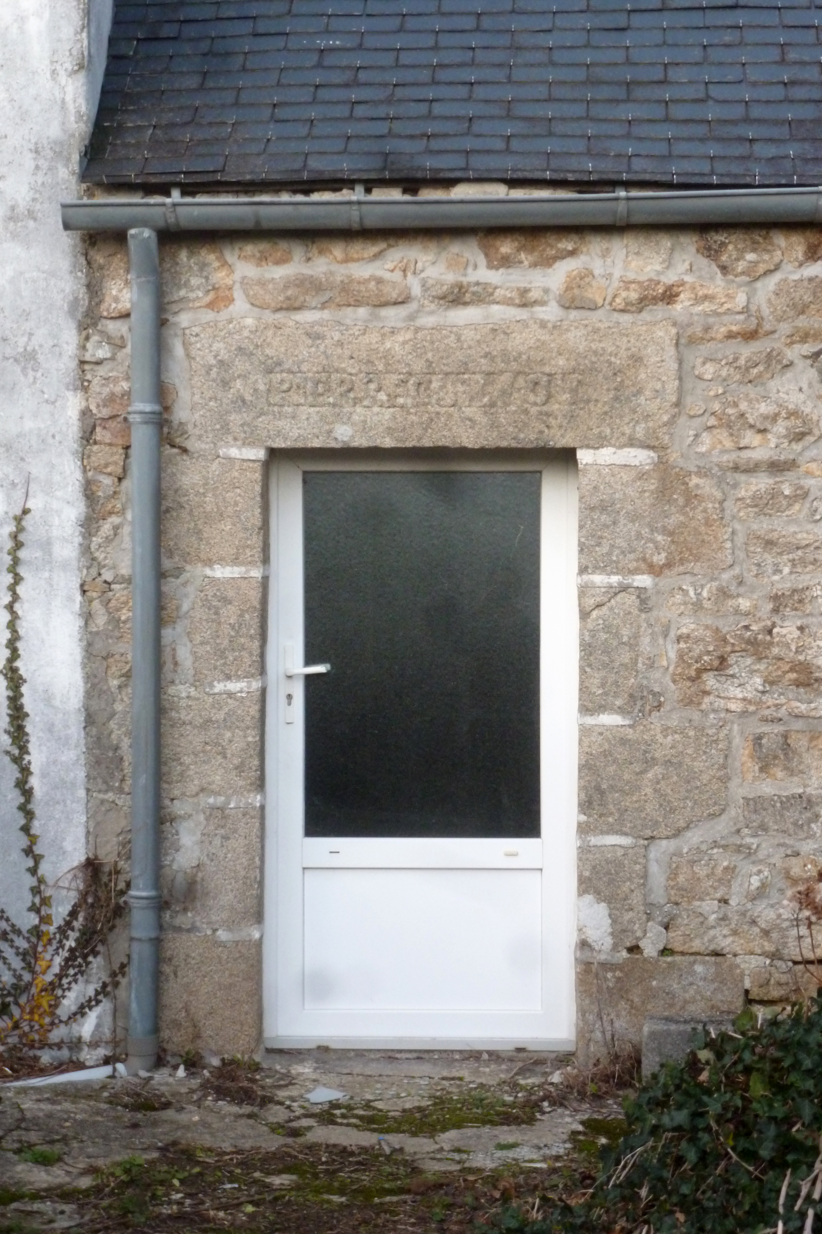 Le bourg, maison à une pièce en rez-de-chaussée, détail de la porte d'entrée et inscription : PIERRE GUILLOU.Immatriculation