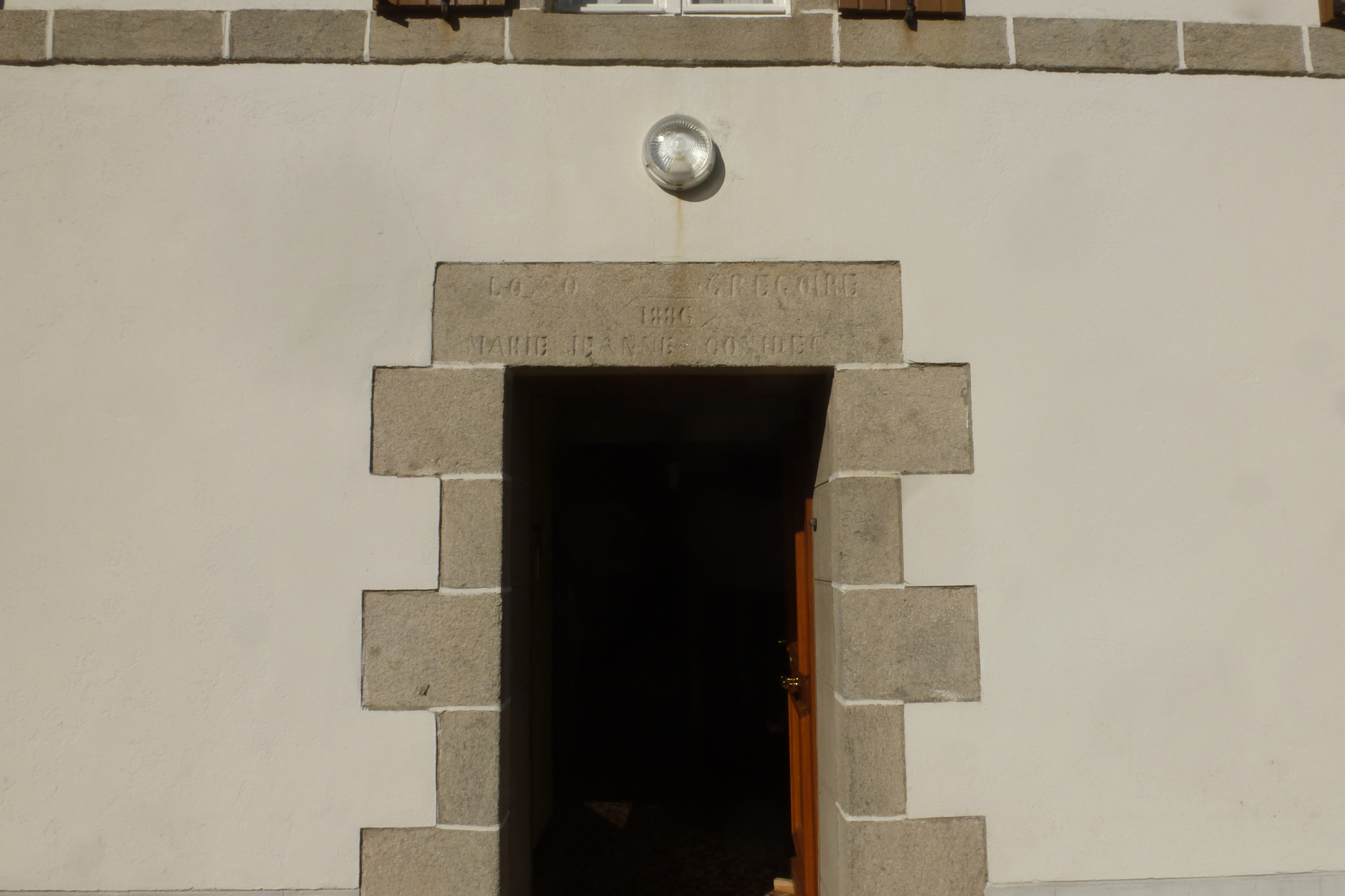 Kergol vraz, ferme 1 datée 1886, détail de la porte d'entrée et inscription : LOXQ GREGOIRE MARIE JEANNE GONIDEC.Immatriculation