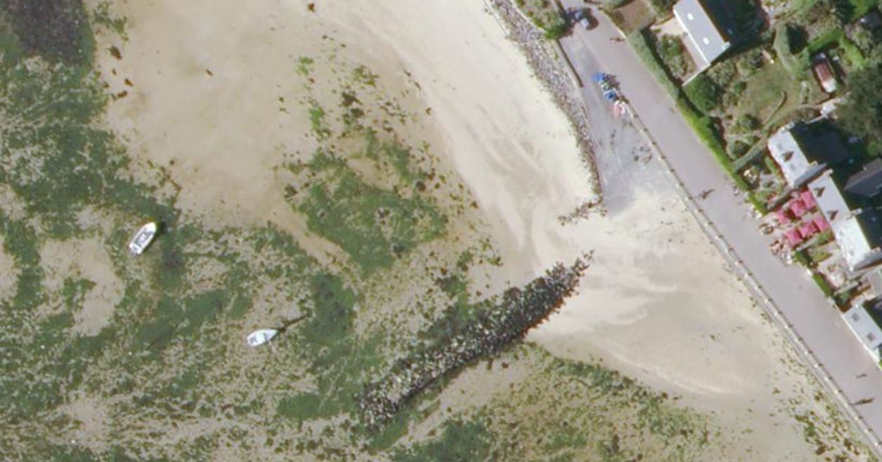 Vue aérienne d'une ancienne cale ou jetée (blocs de roches, (mise en oeuvre en pierres-sèches)Immatriculation