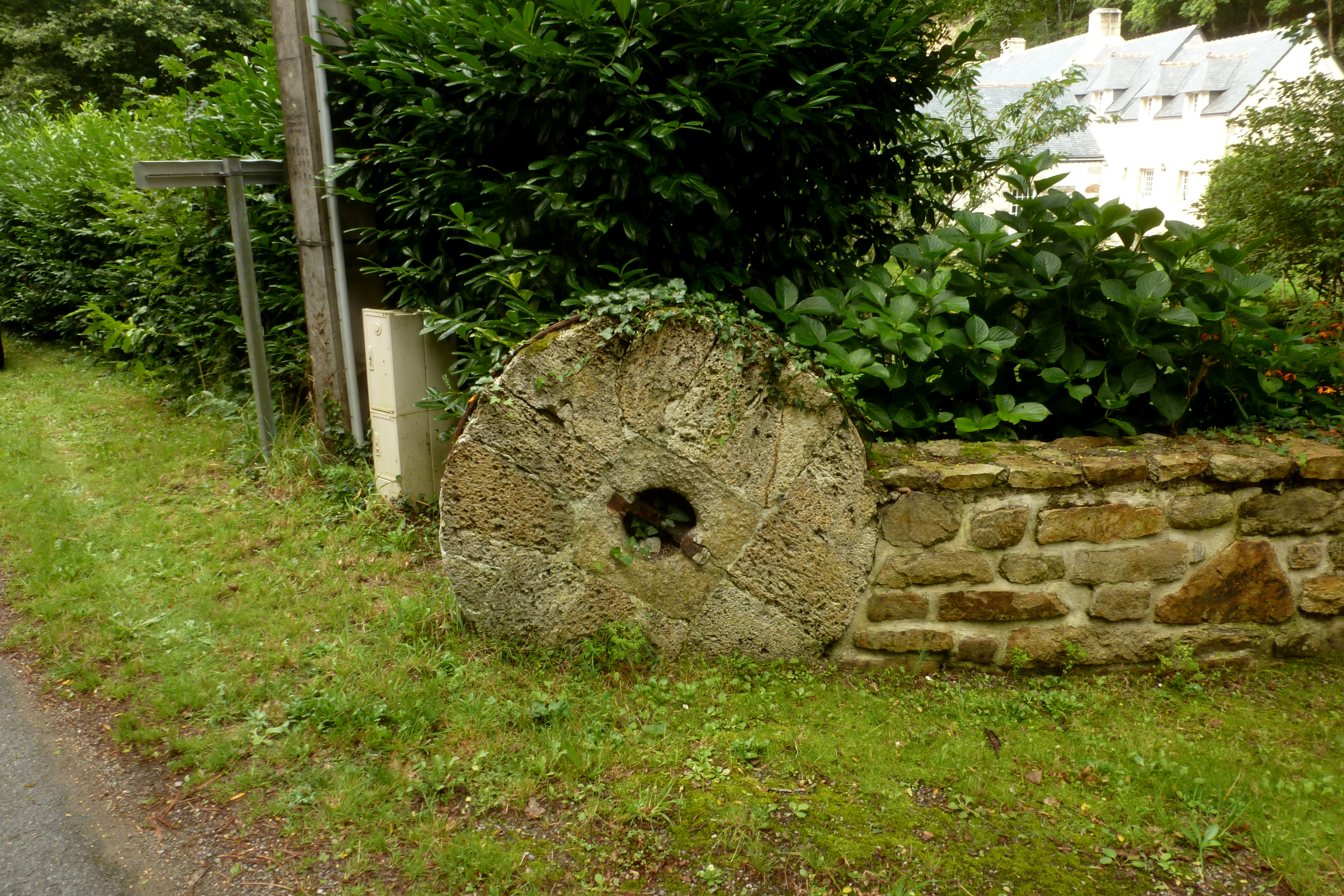 Meule réemployée dans un muret de clôture.Immatriculation
