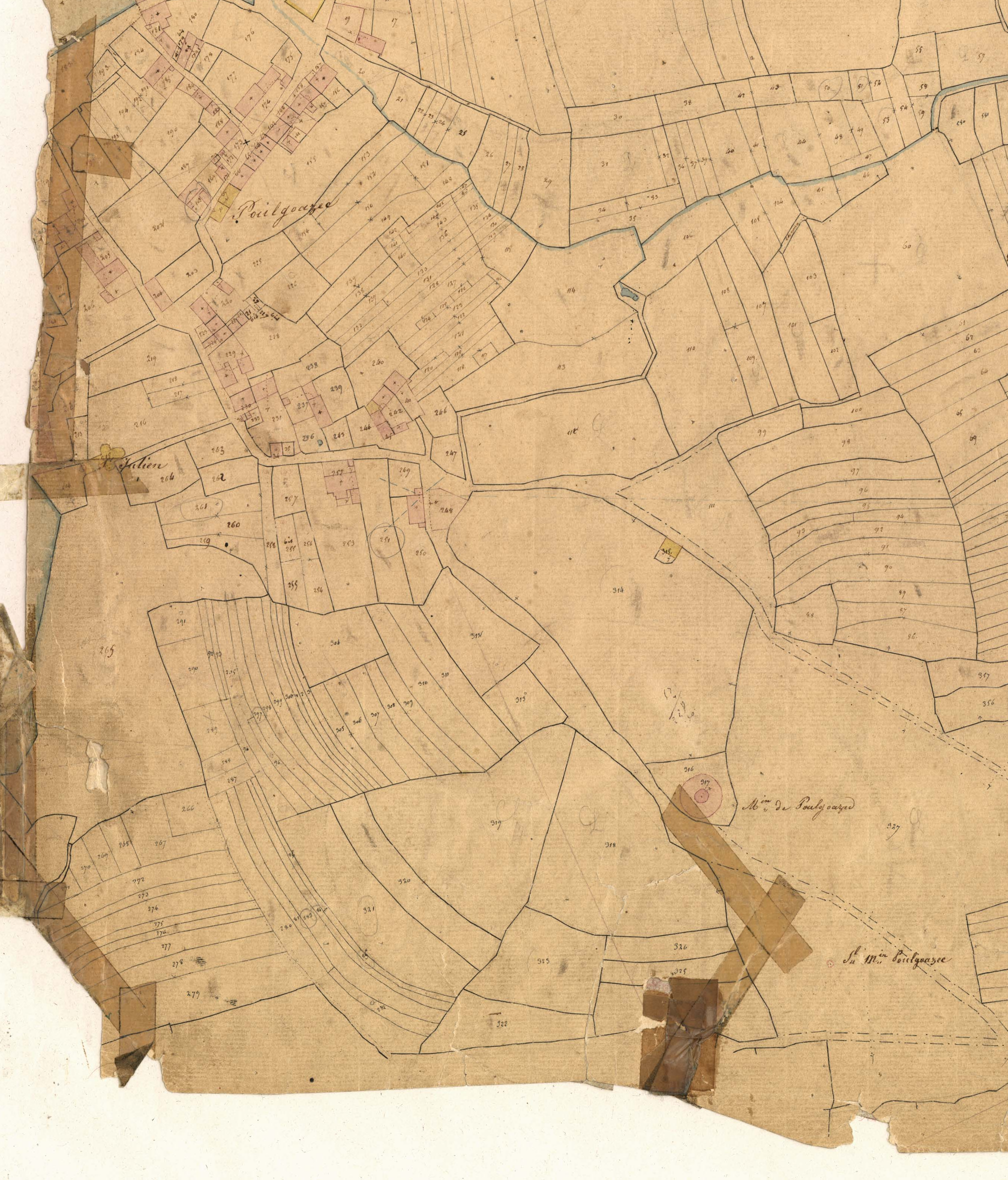 Poulgoazec et moulin. Section H 1 de Lezarouant du cadastre de Plouninec, 1836.Immatriculation