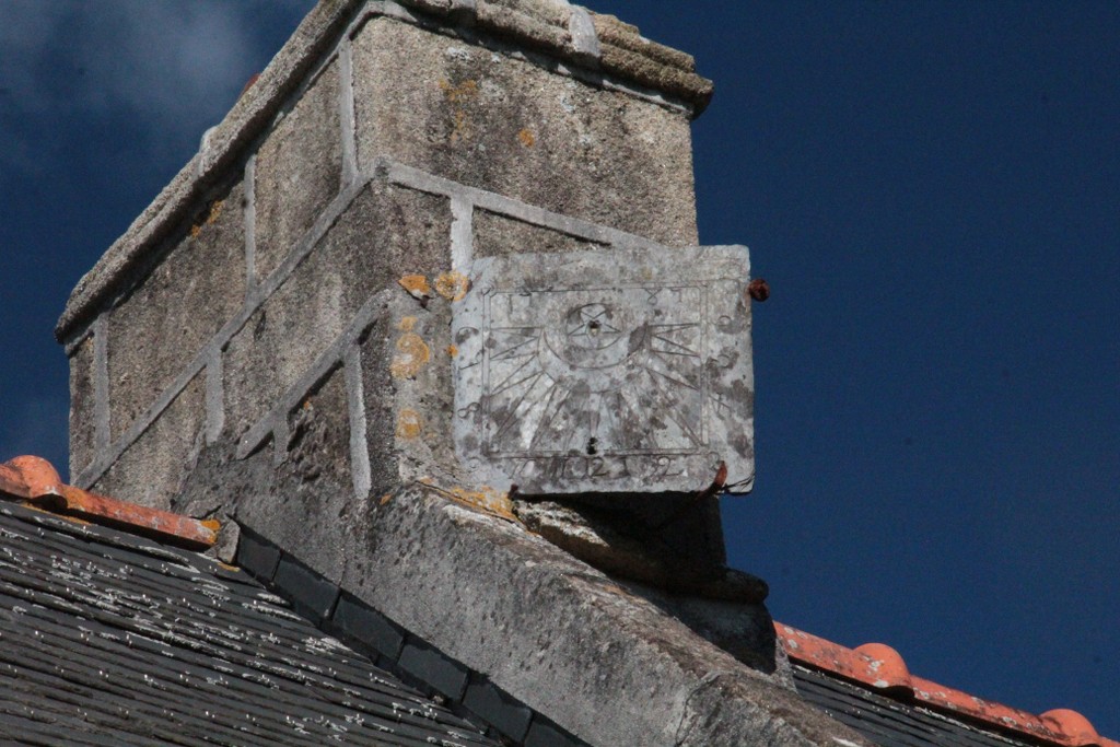 Esquibien, ferme. Cadran solaire daté 1787 sur la souche de cheminée ouest du logis. Forte correction de l'angle pour une exposition plein sud. (2021)Immatriculation