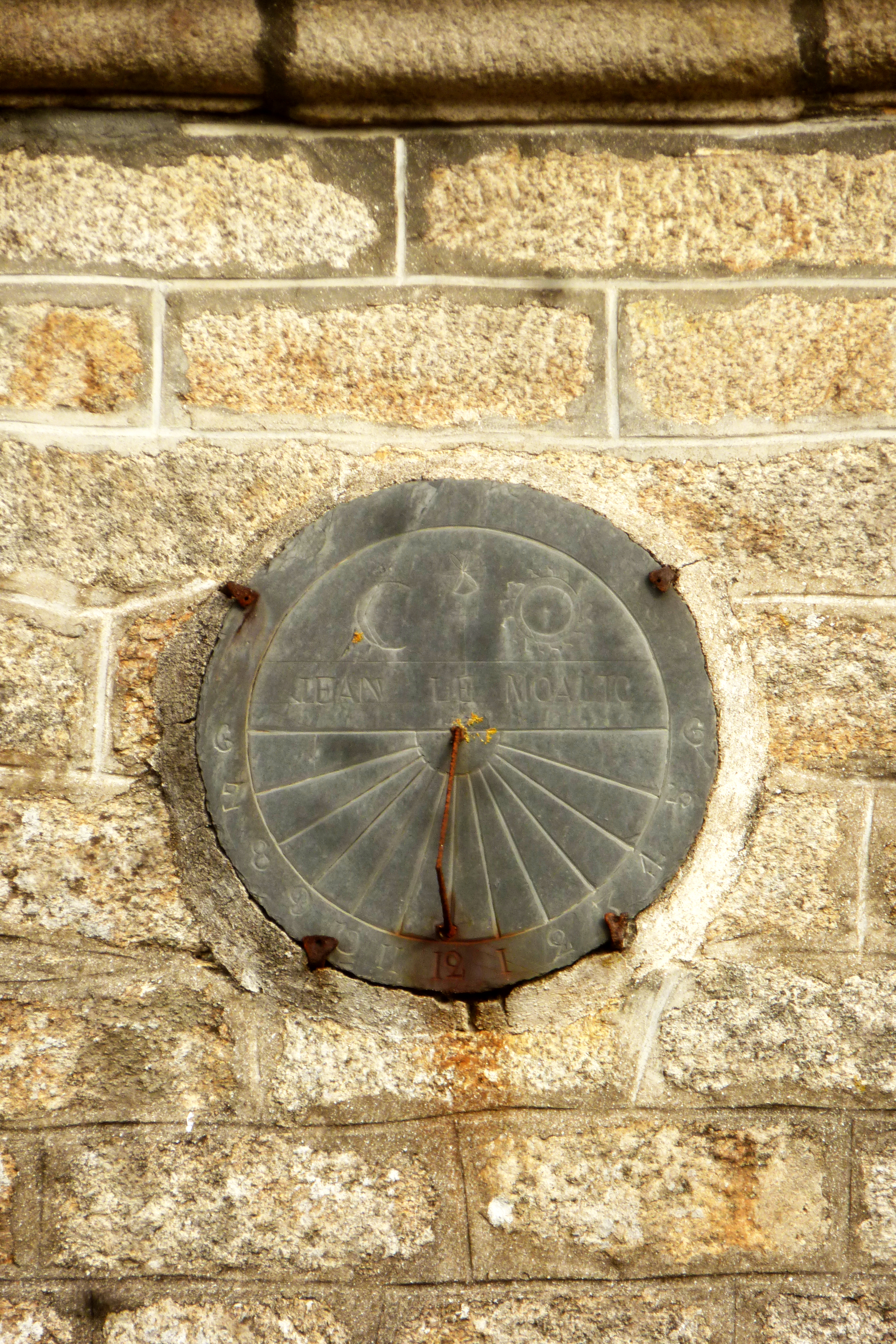 Confort-Meilars, ferme. Cadran solaire sur la façade antérieure du logis. Inscription : JEAN LE MOALIC. (2021)Immatriculation