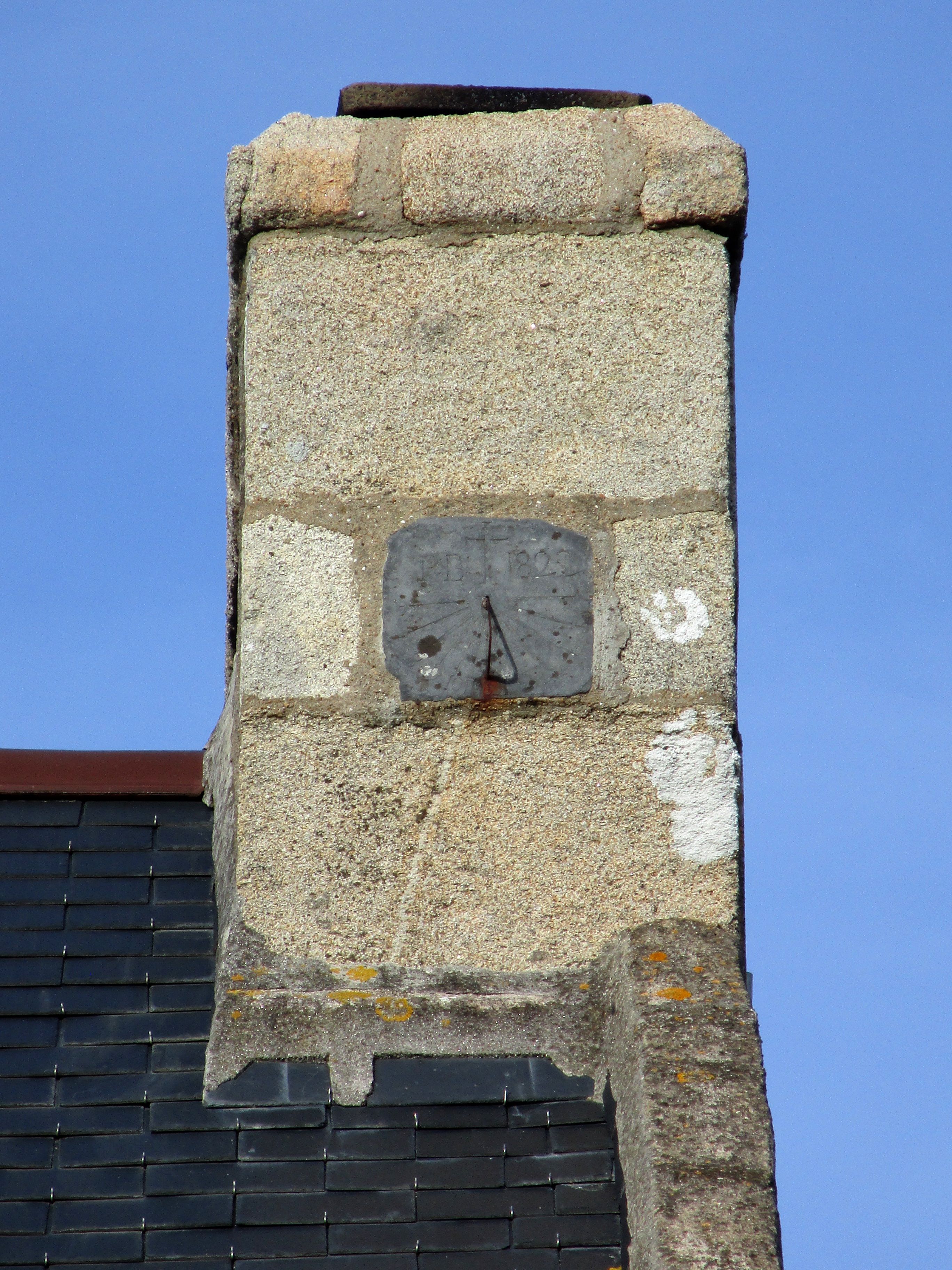 Mahalon, ferme. Cadran solaire sur la souche de cheminée est du logis. Inscription : P:B 1822. (2021)Immatriculation
