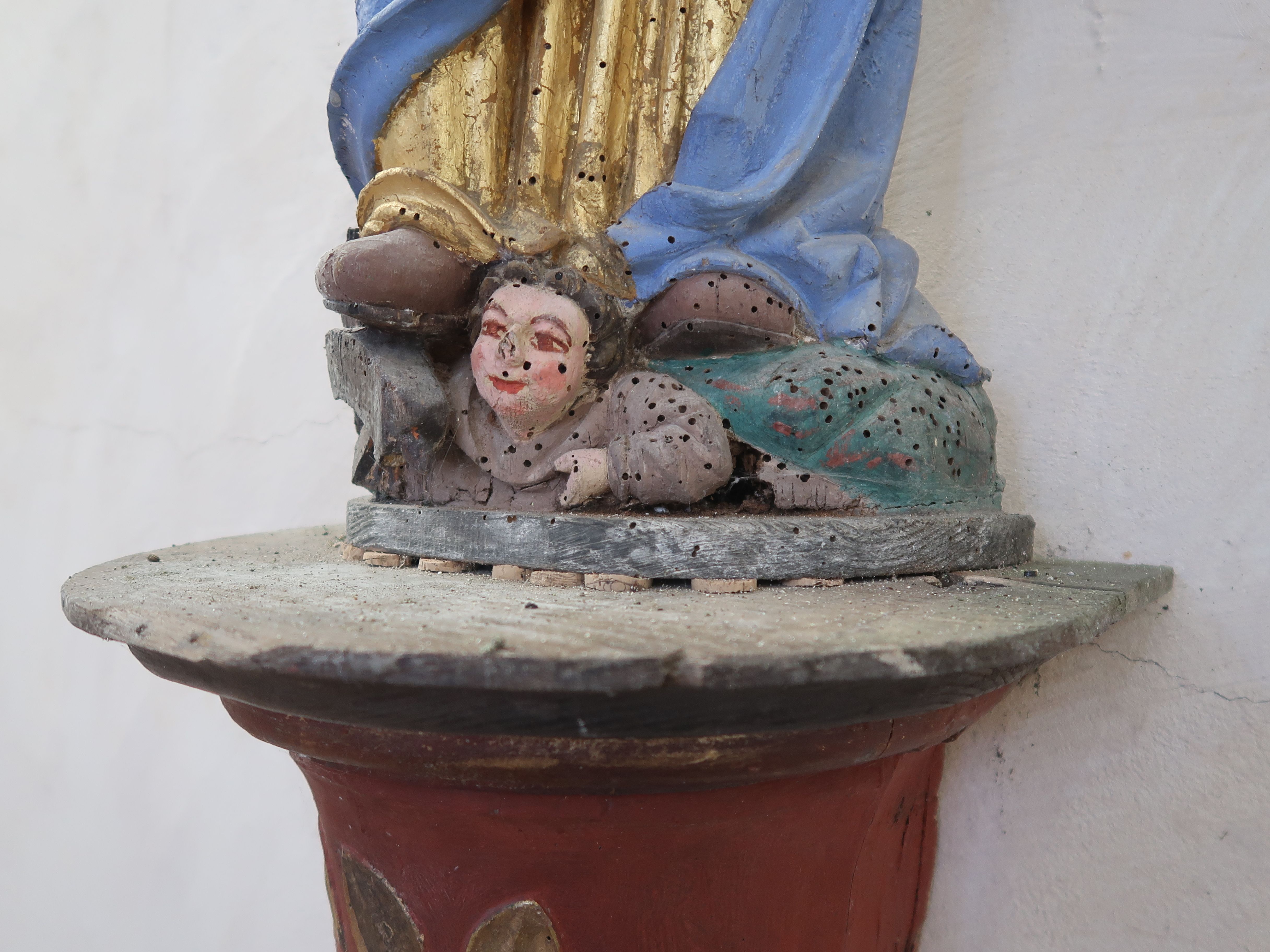 Vue de détail du socle et des éléments sculptés, abîmés par les insectes xylophagesImmatriculation