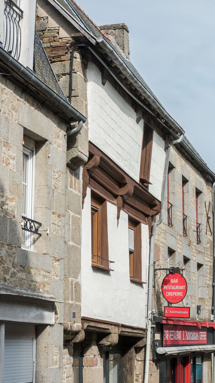 Maison à façade en pan de bois en encorbellement et son surcroît dans leur contexte urbain actuel.Immatriculation