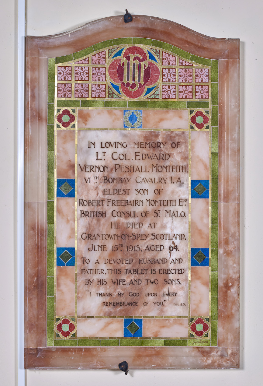 Plaque commémorative en marbre : épitaphe 'A la mémoire d'Edward Vernon Peshall Monteith, lieutenant colonel de cavalerie à Bombay, décédé à Dinard en 1913' (2021)Immatriculation