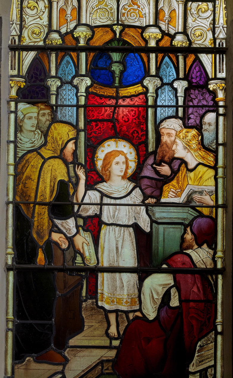Baie n°10, verrière représentant Jésus parmi les docteurs, vue rapprochée (2021)Immatriculation