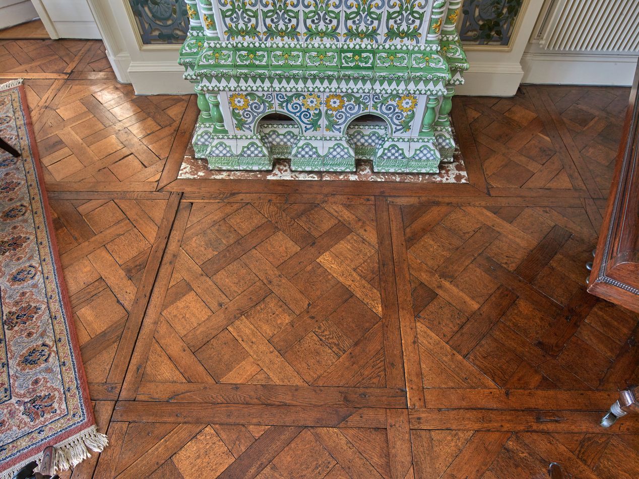 Détail d'un parquet d'assemblage et du poêle en céramiqueImmatriculation