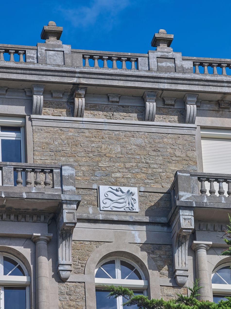 Détail du bas-relief avec poulpe sculptéImmatriculation
