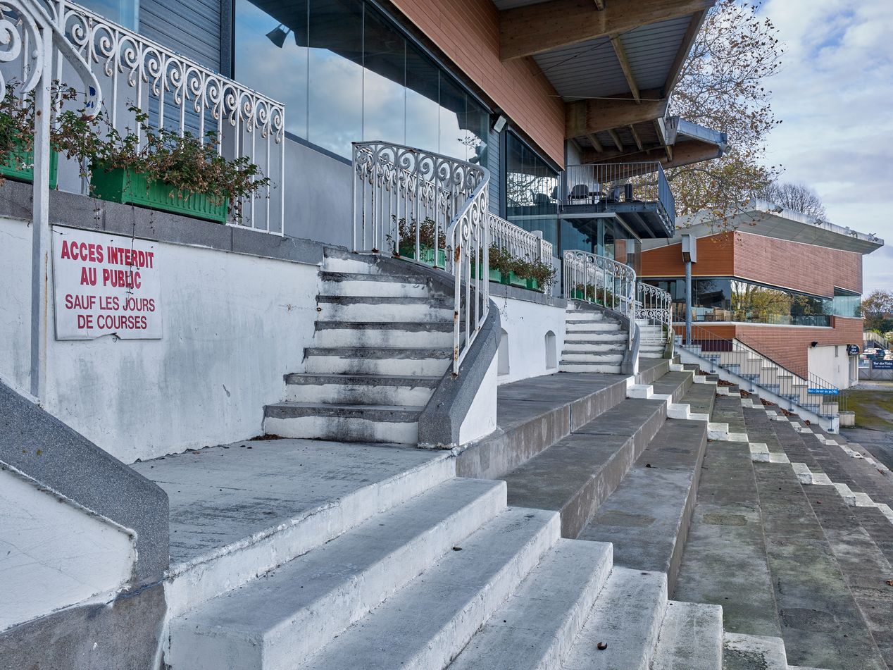 Actuelle tribune, vue de détail des garde-corps anciens en 2021Immatriculation
