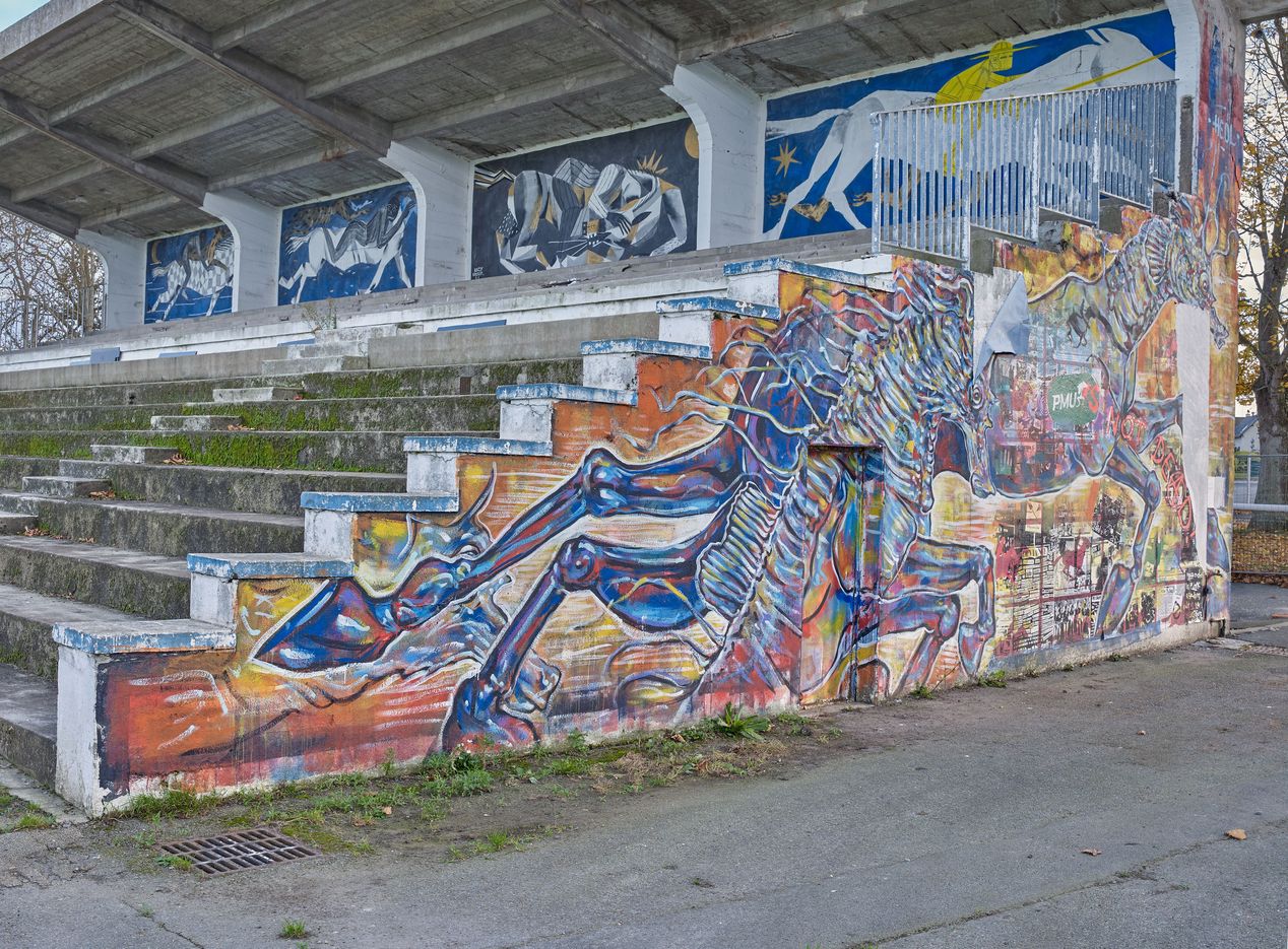 Ancienne tribune est, aujourd'hui détruite, vue latérale en 2021Immatriculation