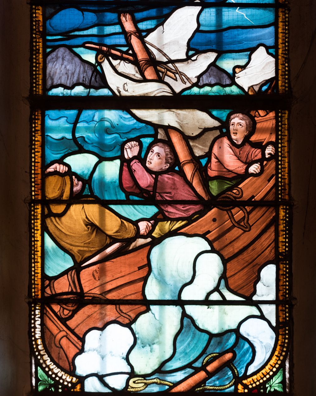 Détail du vitrail de Charles Lorin, 1911, Les marins dans la tempêteImmatriculation