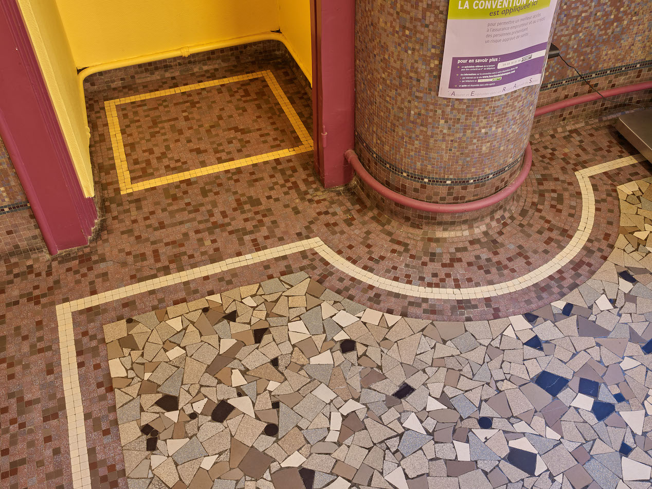 La mosaïque au sol au niveau de la cabine téléphoniqueImmatriculation