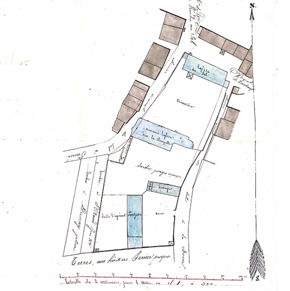 Le bourg entre 1861 et 1863 : l'église paroissiale mentionné au 16e siècle au nord, la chapelle Sainte-Marguerite et le presbytère au sudImmatriculation