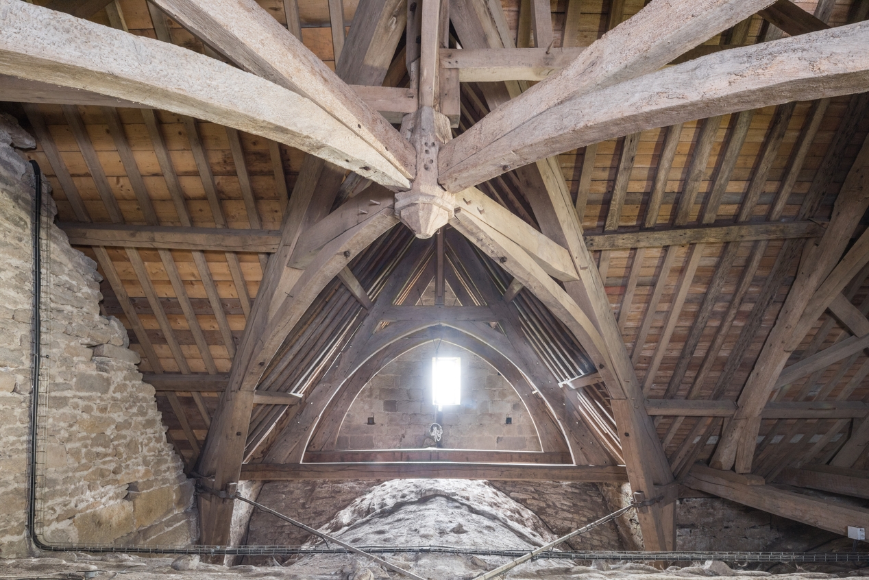 Vue de la charpente de la croisée et du bras nord du transept depuis le comble du bras sud du transept.Immatriculation