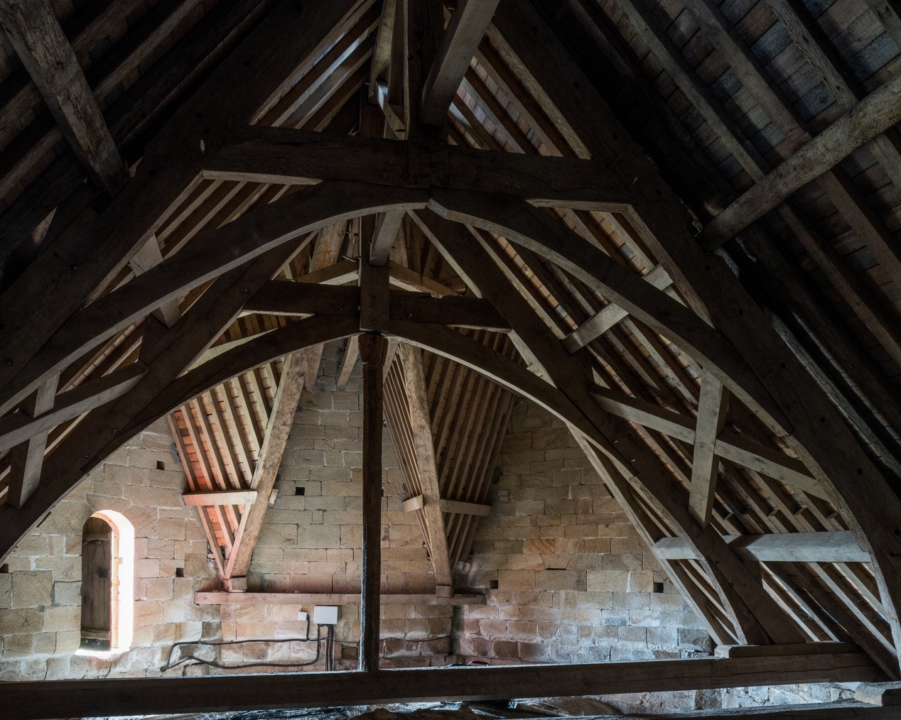 Vue à contre-jour de la charpente du choeur et du revers des pignons de l'abside.Immatriculation