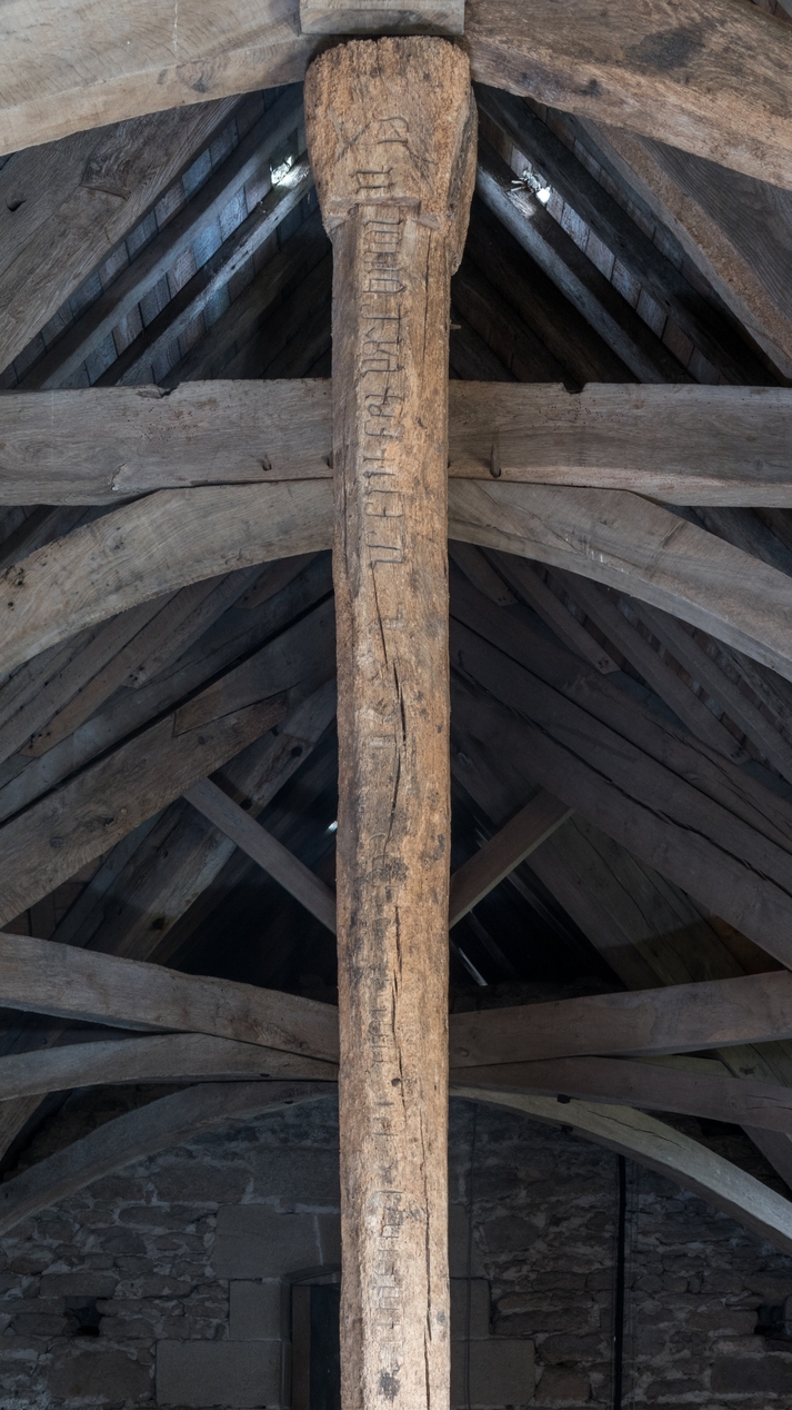Vue de détail de la partie supérieure du poinçon de la ferme orientale de la charpente du choeur.Immatriculation