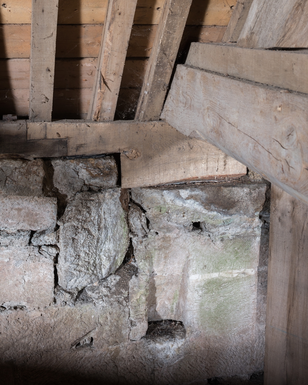 Vue détail : vestige d'empochement au sommet du mur sud de la travée droite du choeur.Immatriculation