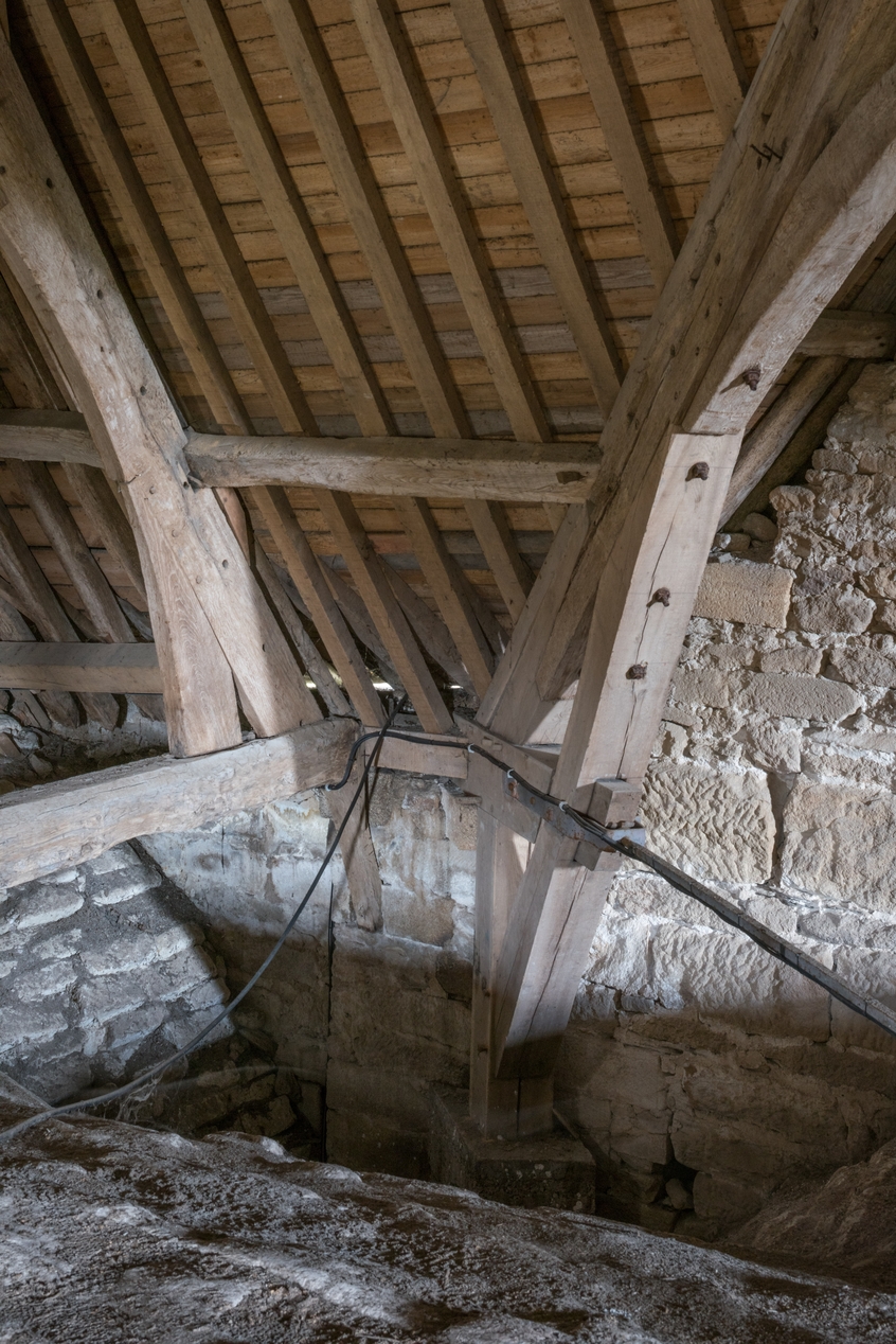 Vue de détail : jonction de la première ferme du croisillon sud et de la ferme oblique de la croisée du transept.Immatriculation