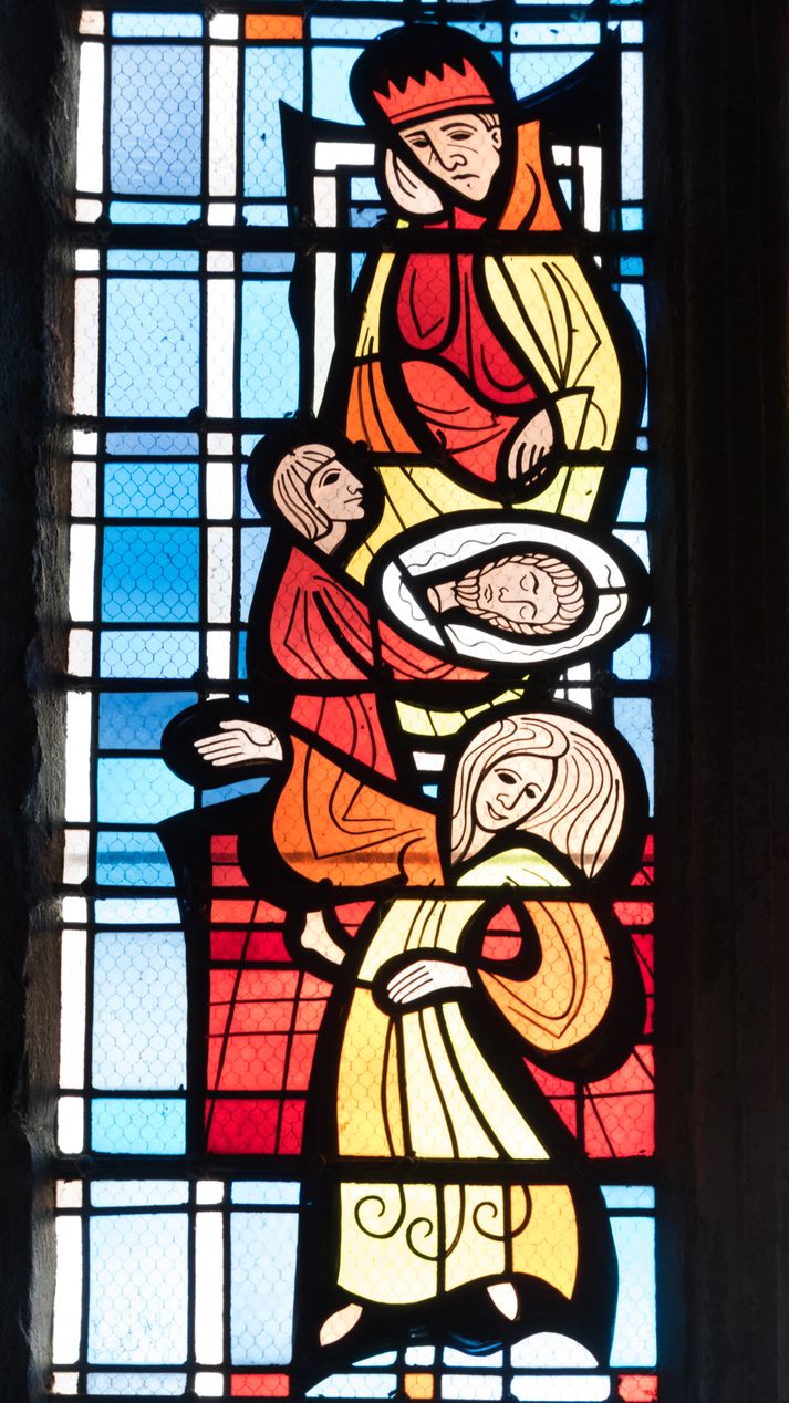 Vue de détail de la maîtresse-vitre : festin d'Hérode et danse de SaloméImmatriculation