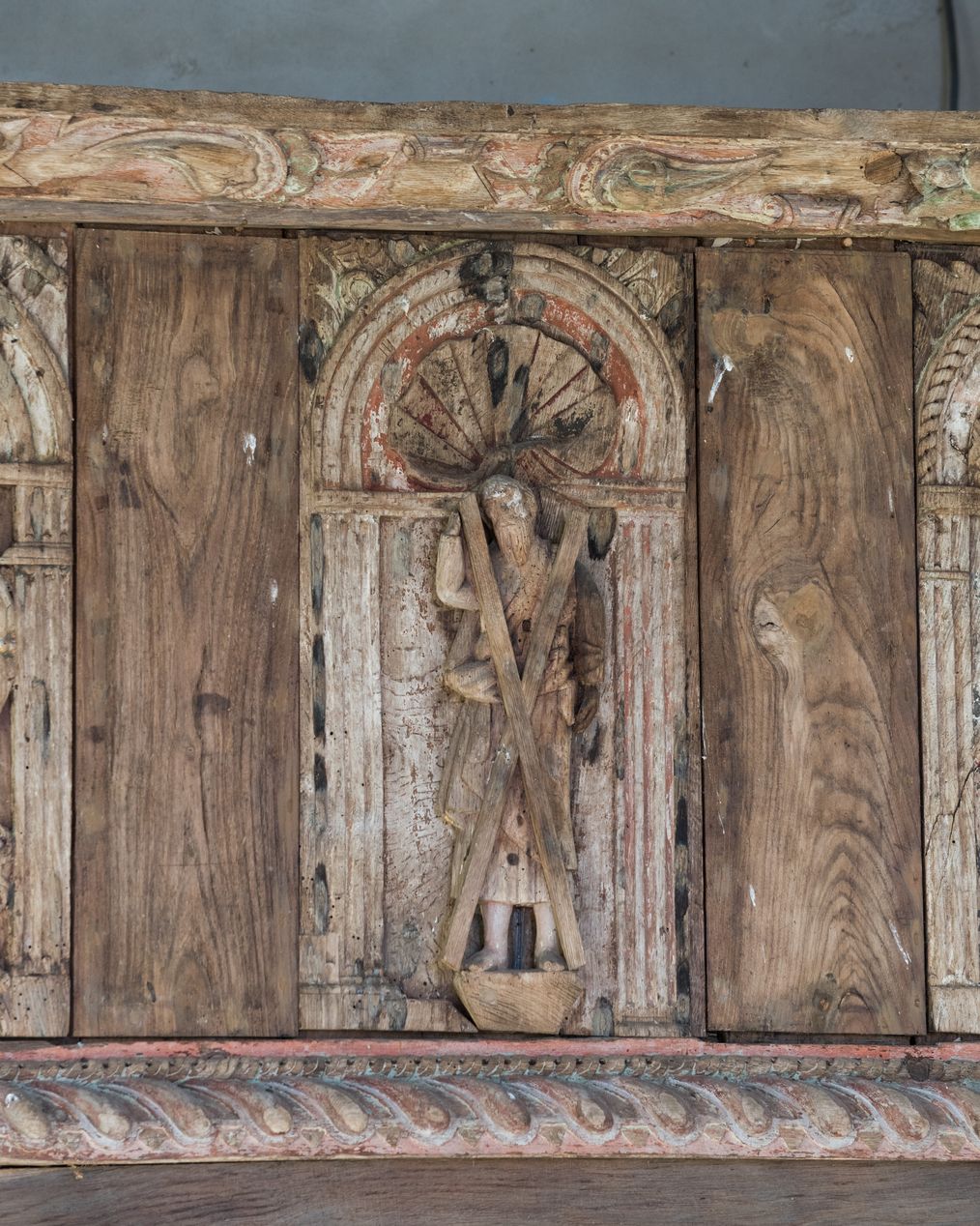 Vue de détail : panneau de la tribune sculpté en bas-relief représentant saint AndréImmatriculation