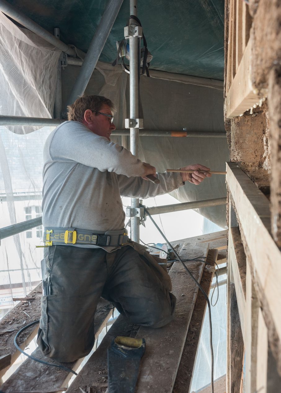 Deuxième étage, insertion d’une cheville dans la pièce de bois remplacée.Immatriculation