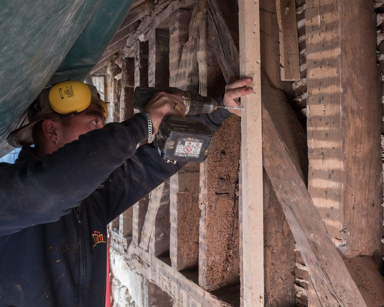 Restauration en cours de la façade en pan de bois.Immatriculation