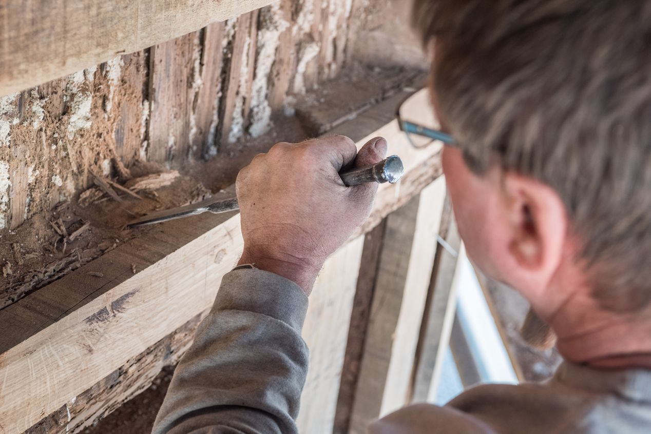 Restauration en cours à l’aide d’un ciseau à bois.Immatriculation