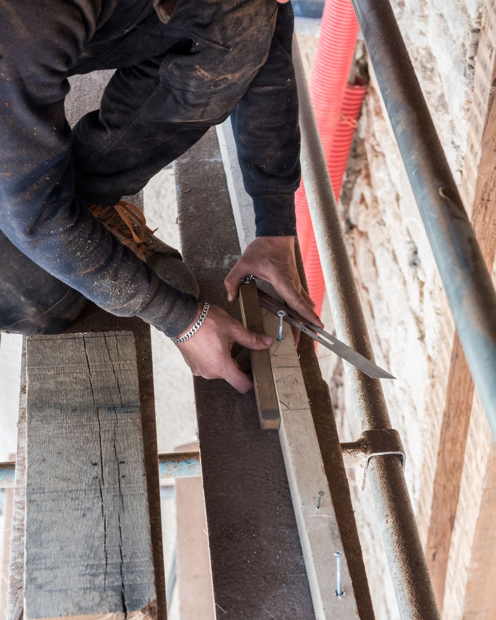 Préparation d’une pièce de bois pour la restauration.Immatriculation