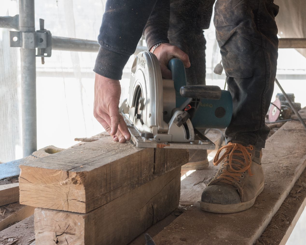 Découpe d’une pièce de bois à la scie circulaire.Immatriculation