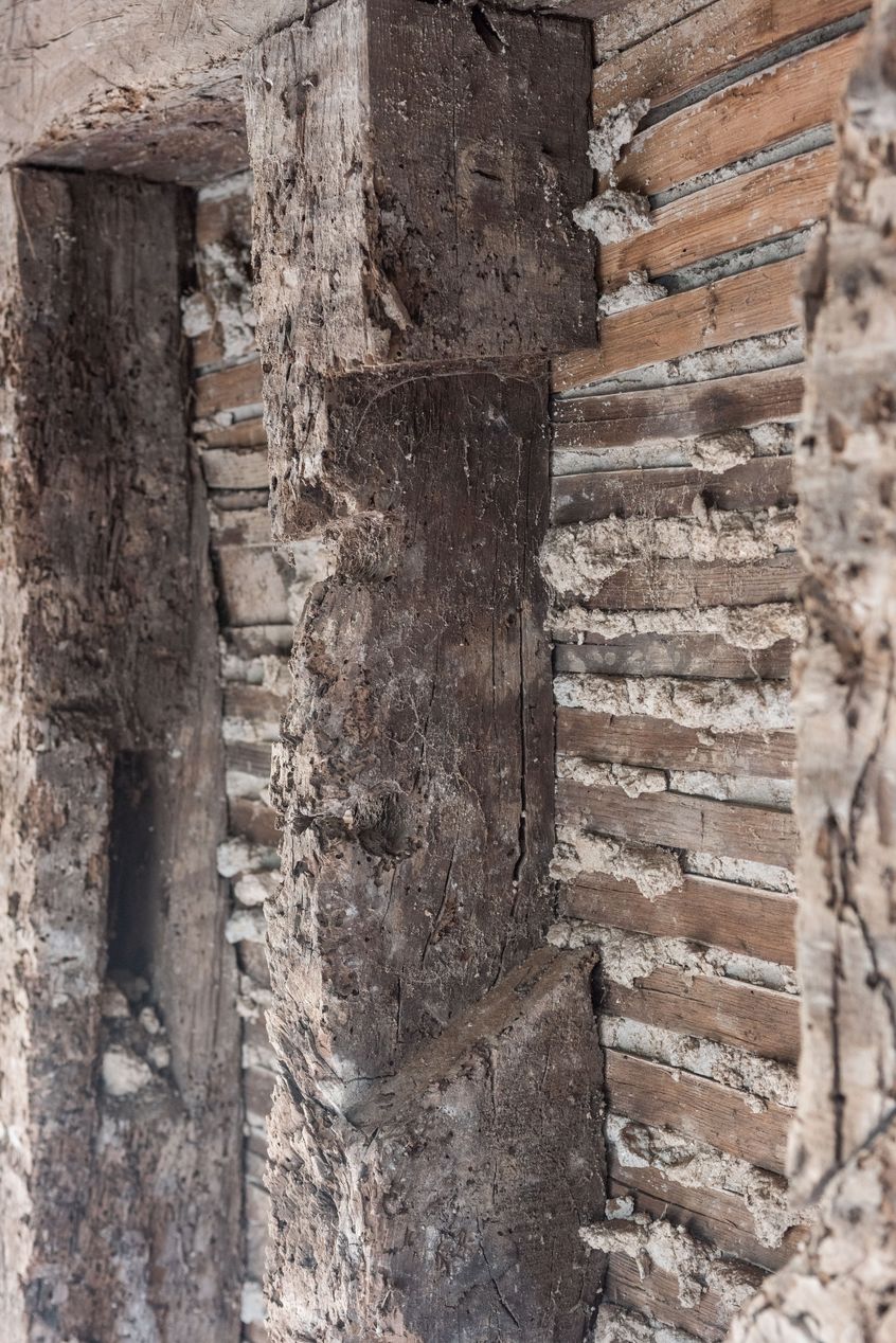 Pièce de bois en remploi au deuxième étage.Immatriculation