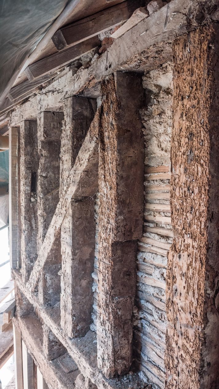 Deuxième étage, façade après dépose de l’enduit.Immatriculation