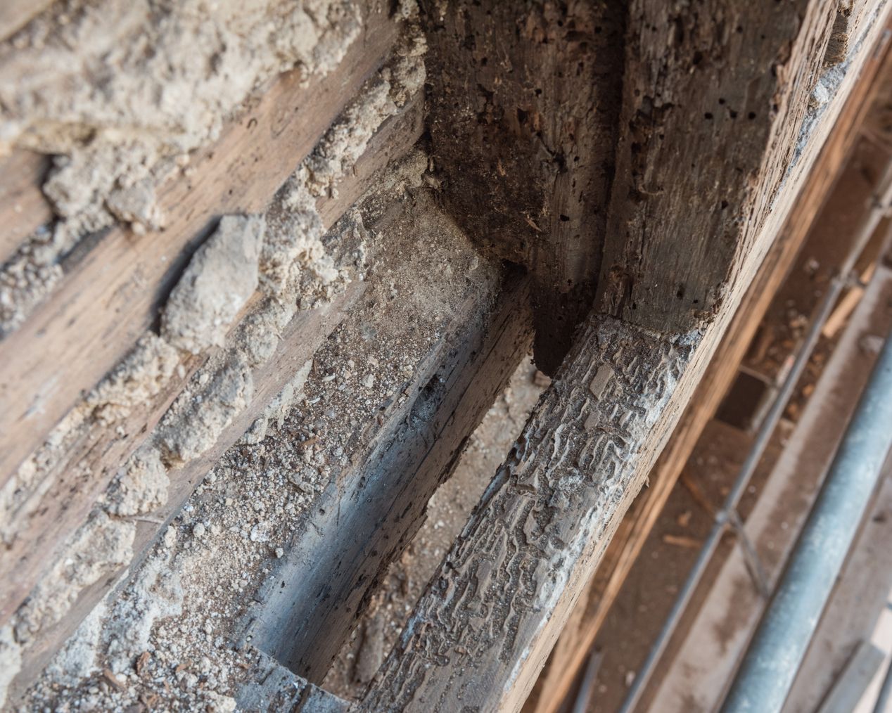 Deuxième étage, assemblage à tenon et mortaise dans une sablière en remploi.Immatriculation