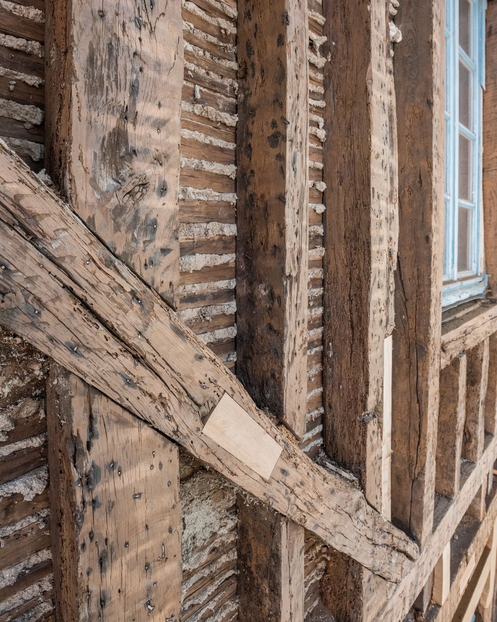 Vue rapprochée de la façade au premier étage en cours de restauration.Immatriculation