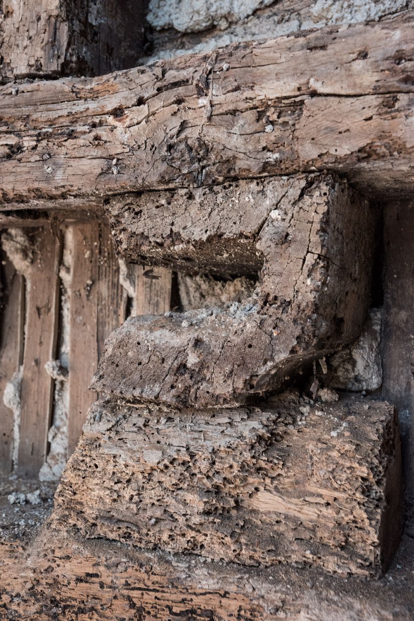 Premier étage, état de dégradation des bois après que l'enduit ait été enlevé.Immatriculation