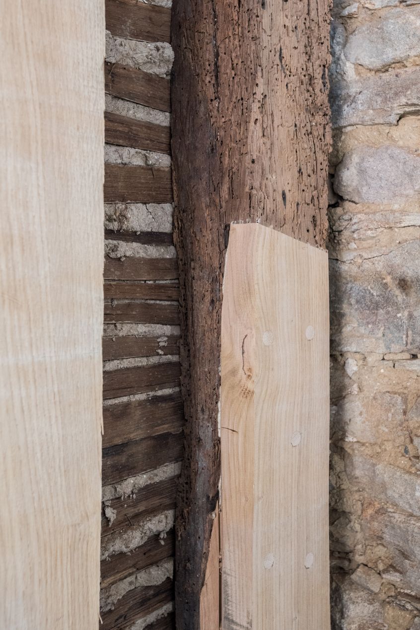 Premier étage, poteau restauré par une greffe de bois.Immatriculation